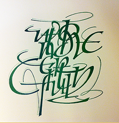 Most of the work you see here is Yvette's commissioned work. Her forte is original letterstyles, and her published work is in collections all over the world such as the court seal, a retirement gift for a judge in Washington D.C., to calligraphy for a book by Barry Moser's Pennyroyal Press. Yvette is an accomplished calligrapher and teacher.